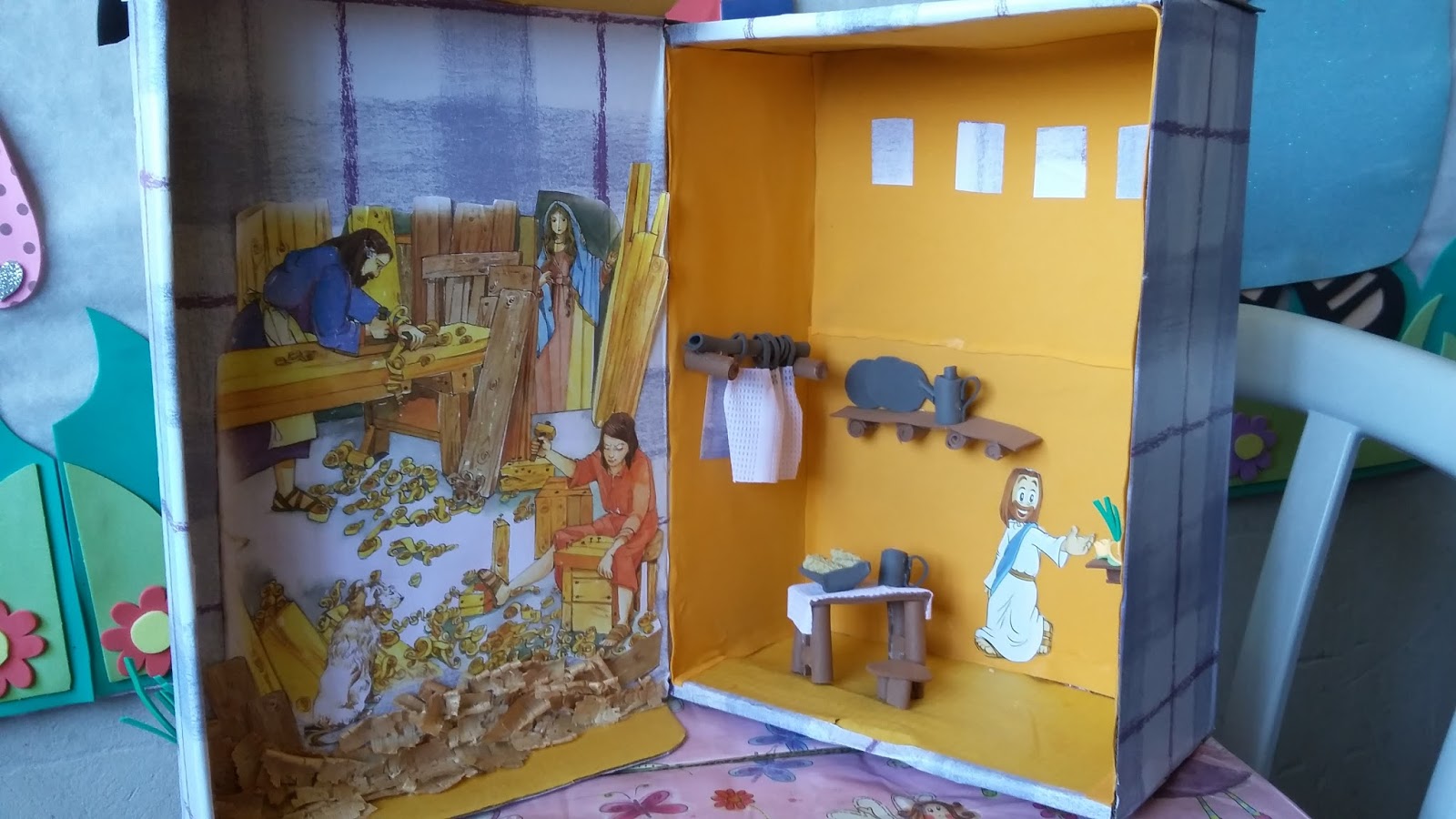 Assim, nossa equipe de produção sob inspiração de nossa linda evangelizadora Cirlene trabalhou para essa finalidade de forma carinhosa, bela e simples. Caixa de papelão, retalhos de EVA, cola, tesoura e muito, muito amor.